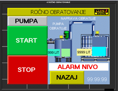 ROČNO OBATOVANJE daje vporabniku možnost ročnega prečrpavanja. Tako prečrpavanje je lahko možno kadar imamo več posod in da ne čakamo da se bo nivo v posodi toliko dvignil da bo aktiviral črpalko,tukaj črpalko startamo ročno preko ke START. Zaradi varnosti je potrebno ko START držati vsaj 1 sekundo da se zavestno sistem vključi. Nivoja trenutnega volumna v litrih pa sta prikazana ob posodah ravno tako pa stanje naprave ali OBRATUJUJE torej da je IZKLOP V SILI NEAKTIVEN ter obratovanje črpalke.