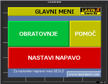 ![]() AVTO OBRATOVANJE meni aktivira pred nastavljene parametre in omogoča popolnoma nadzorovan , večnivojsko varovan in trenutno odziven dozirni sistem na način da aktivira črpalko ob dovolj visokem nivoju hkrati nadzoruje nivo v IBC kontejnerju in izklaplja črpalko ko tekočine v posodi ni več ali pa je nivo v IBC dosežen. Sistem prikazuje trenutno litražo v posodah.Dinamično se prikazuje delovanja cevovoda , stanja črpalke, nivojev v posodah ter trenutni čas. STOP ustavi prečrpavanje in avtomatski nadzor ter vrne v meni OBRATOVANJE NAPRAVA .
