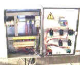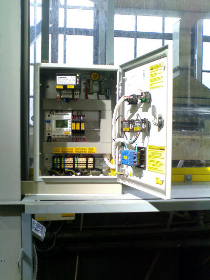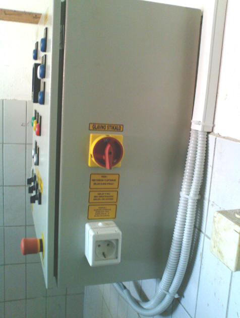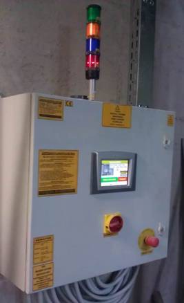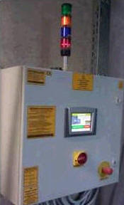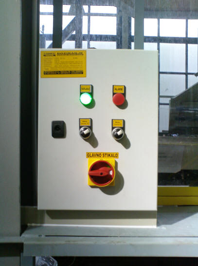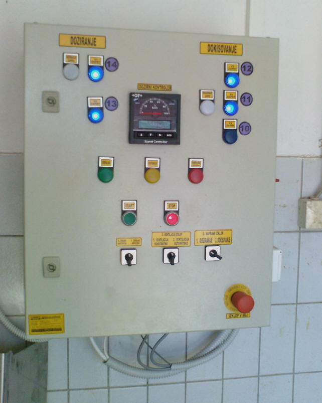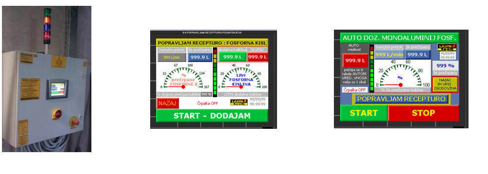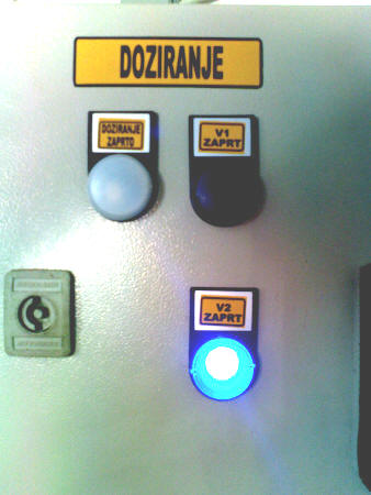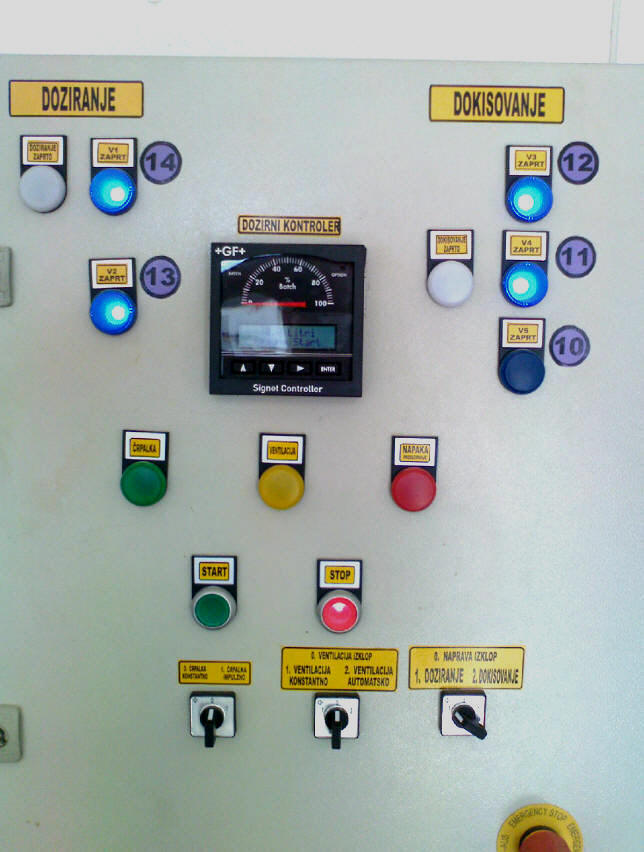1. krmilnega dela ki skrbi za ustrezno varno krmiljenje posameznih komponent preko varnostnih senzorjev in indikatorjev stanja sistema ki so krmiljeni preko izdelanega programa v PLC kontrolerju z dozirnim kontrolerjem z pretokomerom