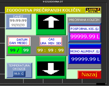 KEMIKALIJE TAKO DA OB MENJAVI OPERATERJA VIDIMO ZADNJE STANJE KOLIČINE KOLIKO JE BILO PREČRPANO IN TUDI KDAJ SE JE TO PREČRPAVANJE ZGODILO . PODATKI ZA PREČRPANO KOLIČINO V ZGODOVINI JE ZA CCA ZA ENO LETO.