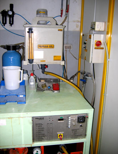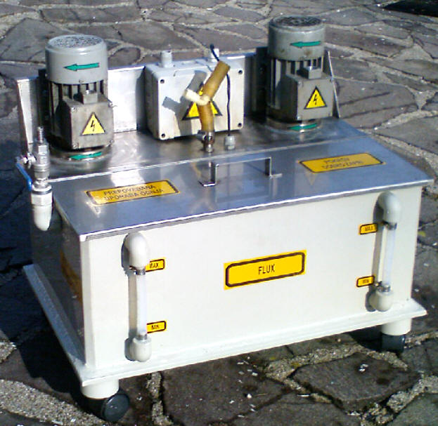 Naprava za jedkanje je namenjena za razstaplanje in čiščenje bioloških usedlin karbonatnih oblog in druge nesnage ki nastajajo v toplotnih izmenjevalnikih. Napravo sestavlja posoda / zbiralnik jedkala, kislinsko odporna črpalka,plastične armature ,cevovodi in krmilna elektro omara s prigrajenim frekvenčnim regulatorjem za direktno krmiljenje pogona na način varnega dela z prilagajanjem pretoka na napravi. | Sistem dela je izveden na način ,da preko kislinsko odpornih armatur na prazne flexibilne cevovode priključimo na toplotni izmenjevalec. Spoji so prilagojen in izvedeni z kislinsko odpornimi holandci kateri se vsakokratno pričvrstijo na opremo. Po izvedbi spajanja se izvede testni preizkus obratovanja z minimalnim pretokom in minimalnim tlakom pod mehansko zaščito , nato se poveča pretok na obratovalni pretok določen preko elektro omare na % skali. | | Črpalke RXL imajo lastnost da lahko obratujejo v suhem teku , medij lahko vsebuje nečistoče in abrazivne delce ne večje od 3 mm ter zaradi izvedbe omogočajo vračanje fluida nazaj v posodo tudi skozi črpalko ko ta stoji. Praznenje tekočine iz zvarjenca tako steče preko flexibilni cevovodov nazaj v posodo po tlačnem cevovodu , kakor tudi sesalnem cevovodu. | Naprava sestavlja zbirna / prečrpalna posoda ki je izdelana iz certificiranih materialov varjena po metodi extrudiranja (DVS) iz materialov ki so odporni na uporabljen fluid. Črpalke je vgrajena v posodo od zgoraj da ni možnosti lekaže in tako zmanjšanje tveganja izcejanja kakor tudi dodatna zmanjševanje nevarnosti v smislu varnosti pred poškodbami naprave. | | Naprava ima prigrajen pokrov oz revizijsko odprtino ,ki je tesnena in privijačena na posodo. |
